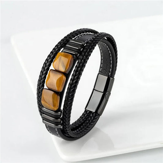 Bracelet en Œil de Tigre 3 Pierres pour Hommes