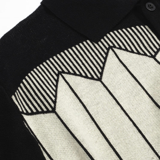 • Polo Tricoté Rétro pour Hommes – Crème Vintage Boutonné avec Graphique Géométrique des Années 70