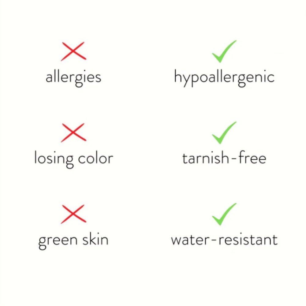 Fabriquée en acier inoxydable étanche, vous n'aurez plus jamais à vous soucier des doigts verts, des bijoux qui se décolorent ou qui ternissent.