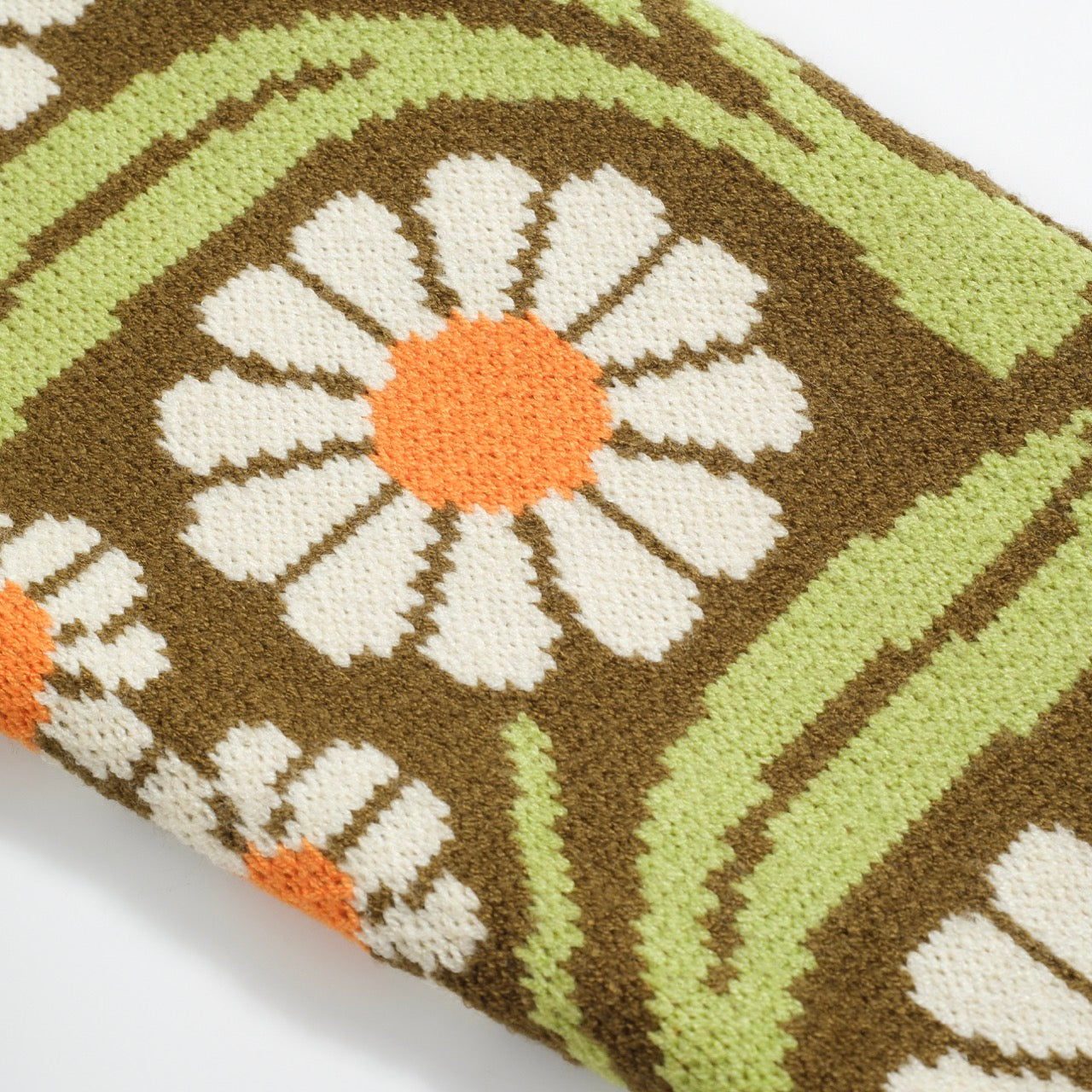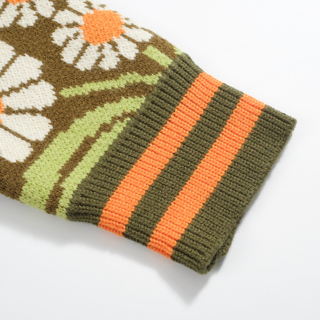 Attirez les regards avec ce cardigan zippé vert olive pour homme, arborant un motif de marguerites ludiques en blanc et orange. Inspiré par les fleurs vintage des années 1970 et les esthétiques MOD, ce tricot est confectionné à partir d'un fil respirant de poids moyen, parfait pour le superposition tout au long de l'année.