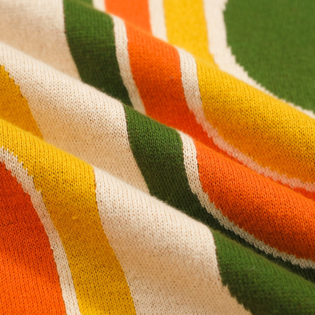 Entrez dans un retour coloré avec ce polo tricoté inspiré des hommes rétro. Présentant des graphiques géométriques vibrants dans des tons frappants de vert, d'orange et de jaune sur un fond crème vintage, ce polo capture parfaitement l'esprit iconique de la mode des années 1970. Fabriqué à partir d'un tissu tricoté confortable, avec un col et des finitions vertes distinctives, c'est une pièce qui fait statement tout en étant à la fois élégante et confortable.