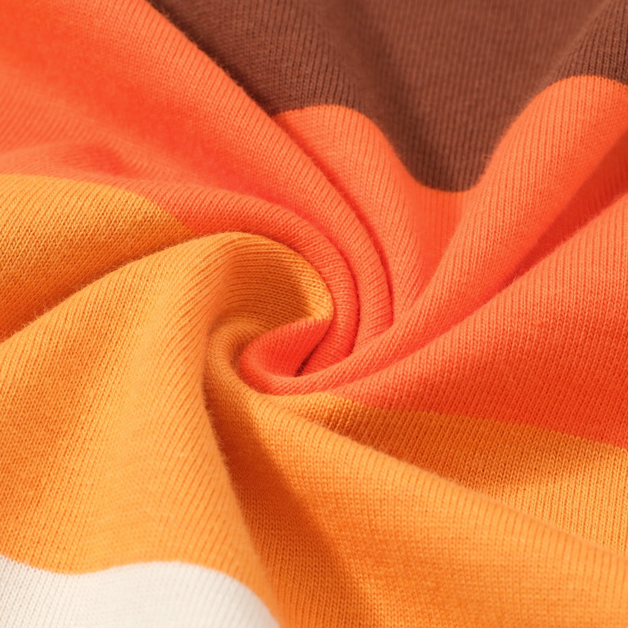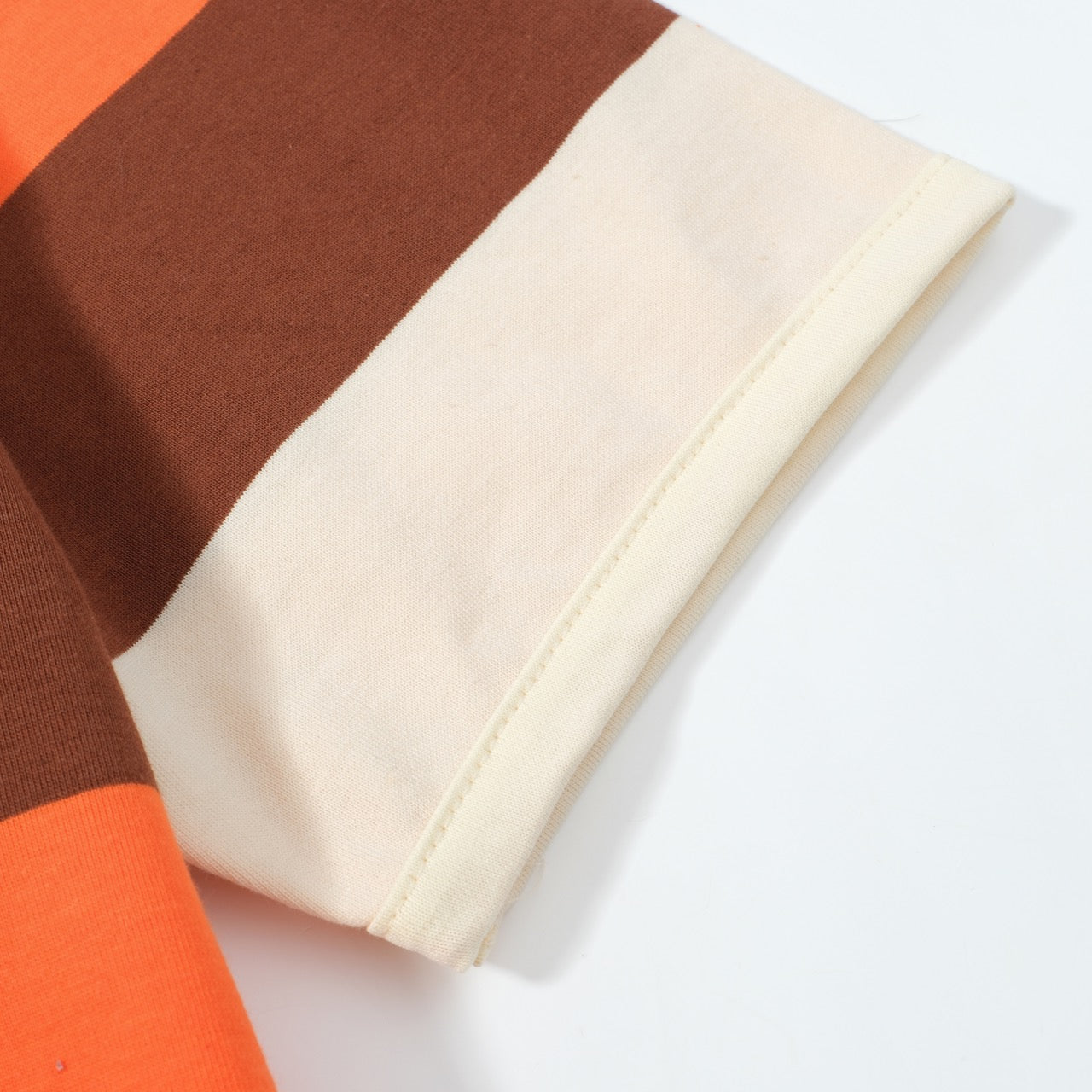 Canalisez la pure nostalgie des années 70 avec ce t-shirt en tricot doux, présentant des rayures horizontales en orange brûlé, jaune doré, marron chocolat et crème. Les tons chauds et saturés évoquent des journées d'été sans fin et des vibrations décontractées de Californie.